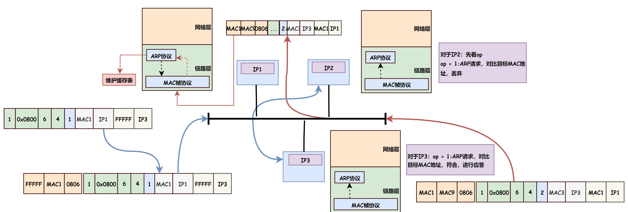 IP1 主机获取 IP3 主机的 MAC 地址: