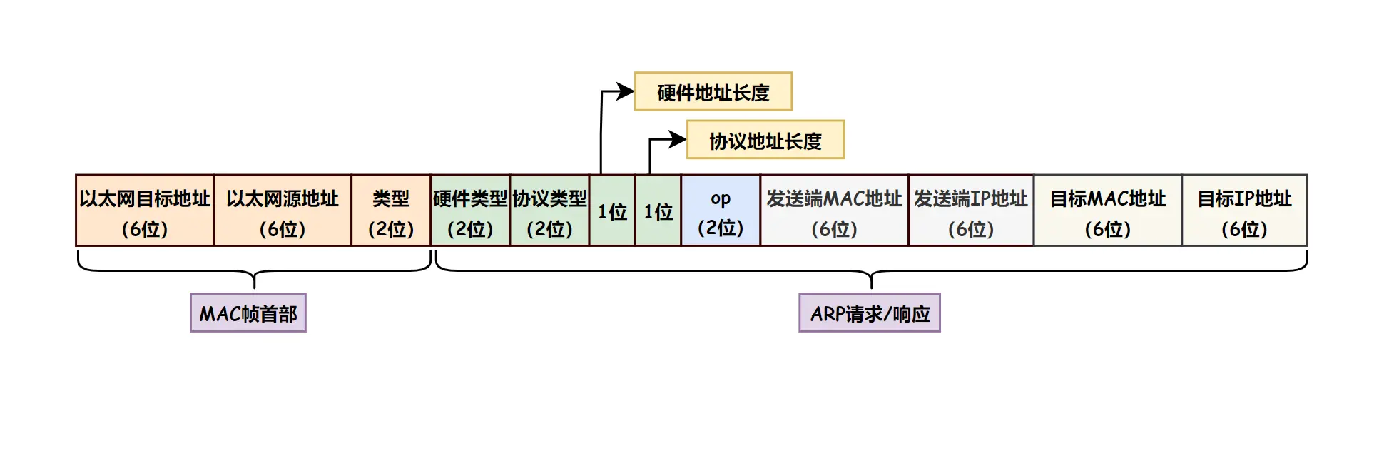 - 协议地址长度对于和 IP 地址为 4 字节;